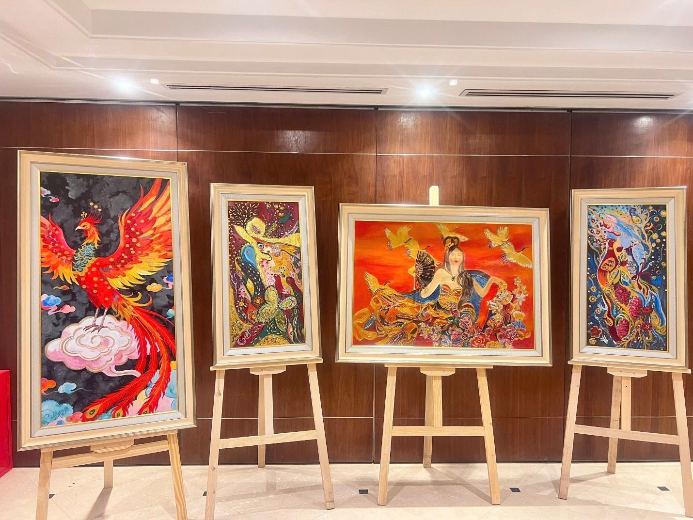 Họa sĩ Hải Xuân: Tôi luôn dành nhiều tình yêu cho tranh trang trí, đặc biệt là những tác phẩm mang tính nhịp điệu, giàu cảm xúc và biểu cảm. Việc kết hợp các chất liệu như hạt trang trí hay dát vàng không chỉ tạo chiều sâu cho tác phẩm mà còn mang lại hiệu ứng thị giác mạnh mẽ, sang trọng và tinh tế.
